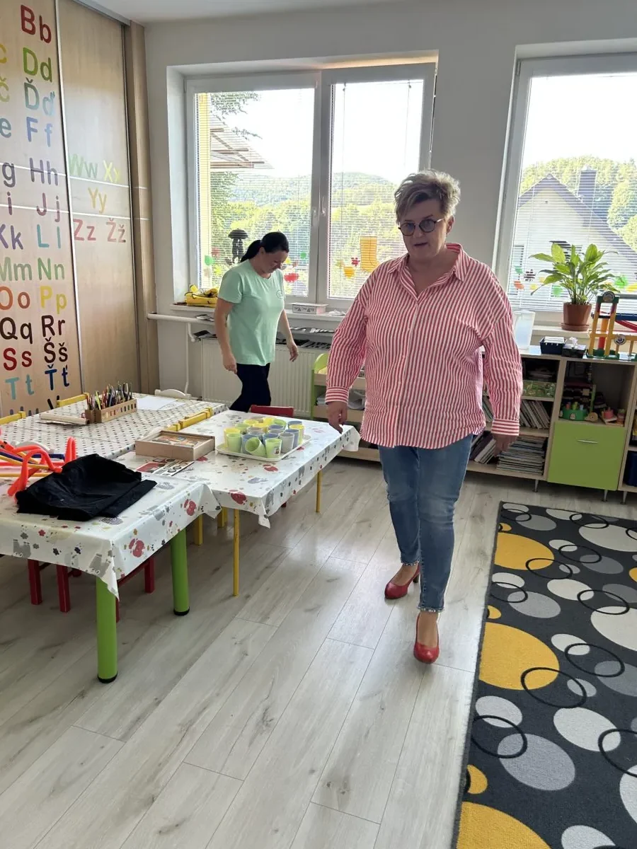 Ideme síce do stacionára, no ocitáme sa v škôlke. V jednej triede totiž dávala obec robiť nové podlahy, ktoré sa však na niekoľkých miestach vyduli, a tak sa pani starostka zastavuje skontrolovať ich. Pozdraví učiteľky, kuchárky sa opýta, čo dnes chystá na obed, osloví deti, objíme svoju vnučku predškoláčku, ukáže mi triedy, v ktorých sa učia deti od prvého po štvrtý ročník, a zastavíme sa aj na krátky rozhovor s riaditeľkou školy Monikou Riškovou. Cestou v aute mi prezradí, že túto pani riaditeľku si veľmi váži a obdivuje. Škola v zriaďovateľskej pôsobnosti obce má aktuálne asi 30 detí v dennej forme štúdia a takmer 220 detí s individuálnym vzdelávaním, tzv. domškolákov. „Veľmi dobrých ľudí mi Pán Boh posiela, bez nich by som neurobila nič.“